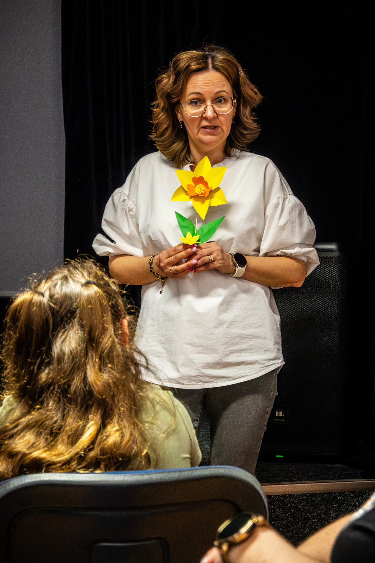 Następnie dzieci obejrzały animowany film przygotowany przez Hi-Story, oparty na opowiadaniu Zofii Staneckiej „Pamięć drobinek”. Historia zabrała małych widzów do magicznego świata dobrych duszków, opiekujących się lasem i jego mieszkańcami. Główna bohaterka, Borówka, wyrusza w podróż, aby odnaleźć swojego brata Maślaka, który zaginął w tajemniczych okolicznościach. Film w niezwykle przystępny sposób poruszył ważne tematy - empatii, sprawiedliwości oraz pamięci i straty. Po seansie dzieci zostały podzielone na grupy. Jedna z nich przygotowywała symboliczne żonkile z papieru - znak pamięci o bohaterach powstania w getcie. Druga stworzyła dla Maślaka i Borówki peleryny „superdrobinek” - strażników wspomnień, których zadaniem jest dbać o to, aby historia nie została zapomniana.