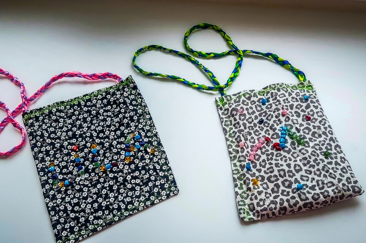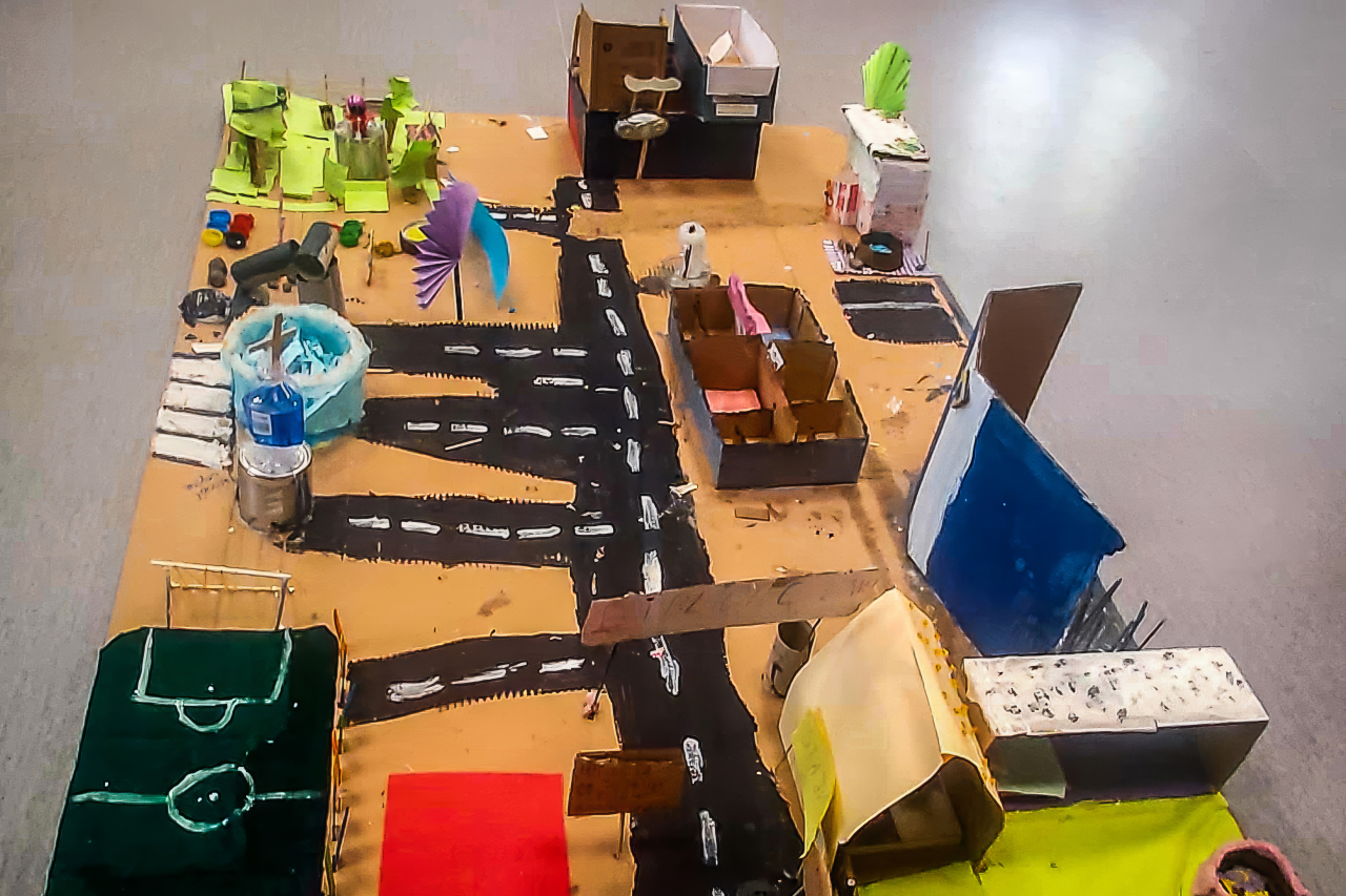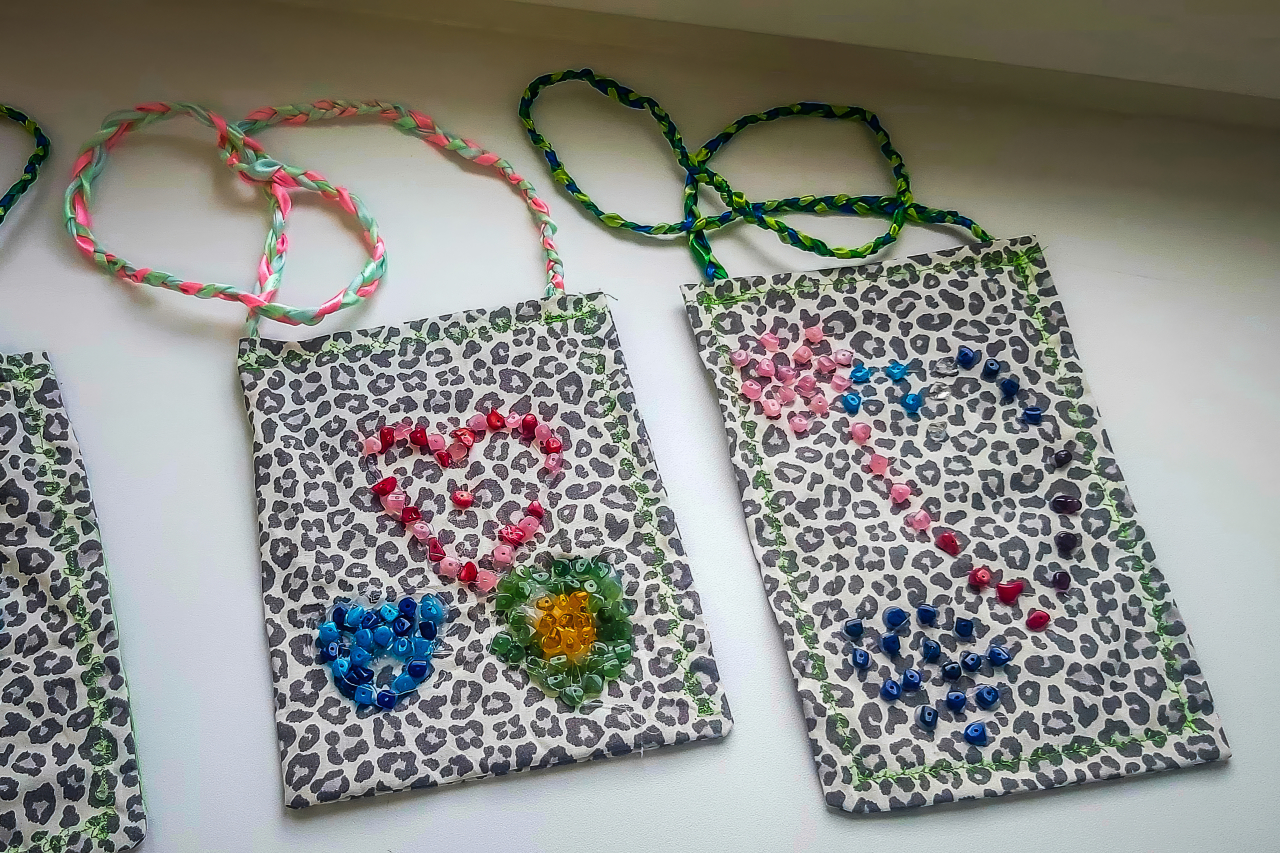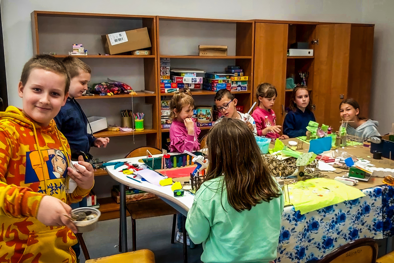 Nie zabrakło też zajęć manualnych. Podczas warsztatów „Grubymi nićmi szyte” dzieci samodzielnie uszyły piękne, kolorowe torebki z materiałów, ozdobione błyszczącymi kamykami. W duchu ekologii i kreatywnego recyklingu powstała imponująca makieta „Biblioteczkowo”, wykonana z kartonów, butelek, puszek i resztek tkanin. Dzieci miały mnóstwo pomysłów i stworzyły przestrzeń do dalszych zabaw.
