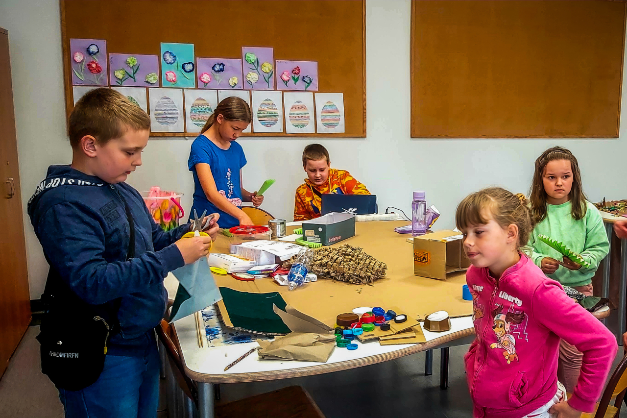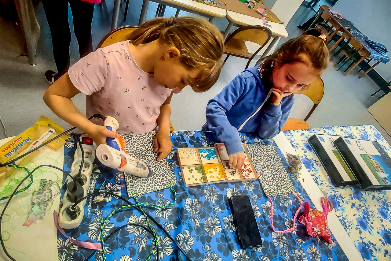 Podczas warsztatów krawieckich prowadzonych przez panią Katarzynę Grendus, dzieci stworzyły urocze ozdobne chmurki z materiałów. Na zajęciach kreatywnych uczestnicy mieli okazję ozdobić bawełniane torby cytatami, ilustracjami i motywami literackimi. Powstały także barwne, ręcznie malowane kamyki z postaciami z bajek oraz ulubionymi cytatami.