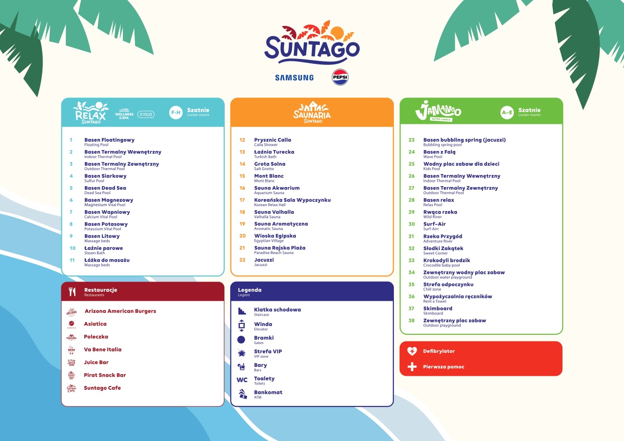 Suntago Wodny Świat jest największym zadaszonym parkiem wodnym w Europie. Na jego terenie znajdują się trzy strefy tematyczne - Jamango Wodna Dżungla, Relax Suntago oraz Saunaria Suntago. Pierwsza strefa jest oczywiście przeznaczona do wodnych szaleństw. Goście znajdą tam 32 zjeżdżalnie o łącznej długości 3 kilometrów i najdłuższą, krytą zjeżdżalnię w Europie o długości 320 metrów.