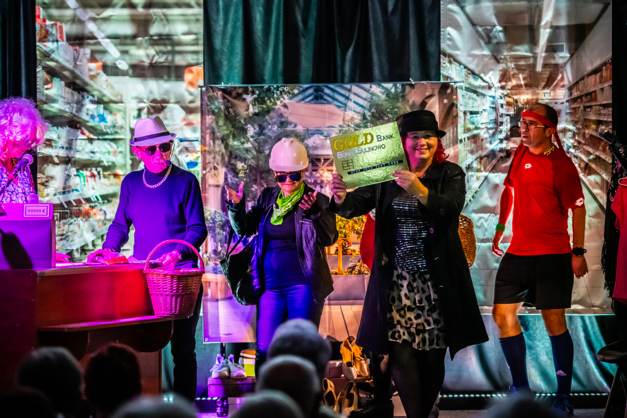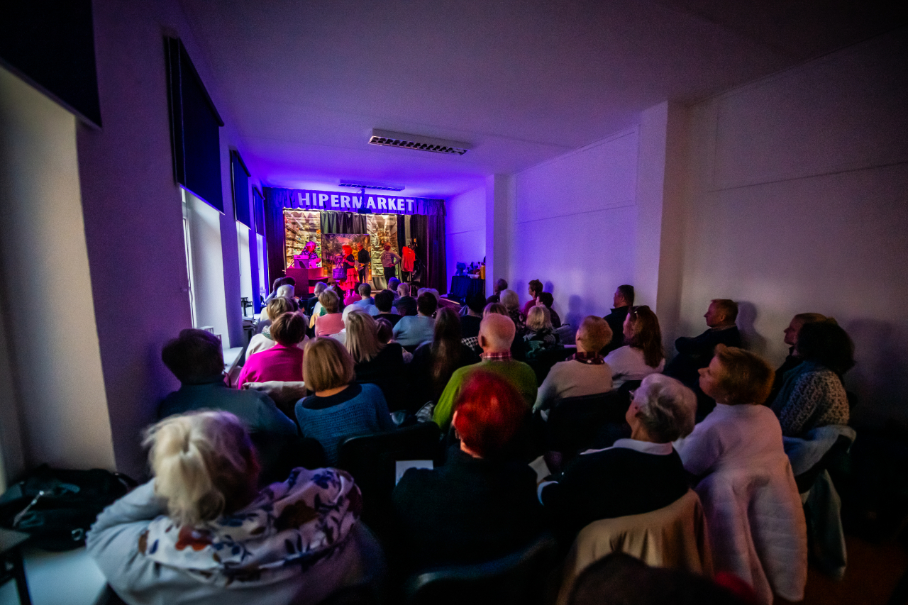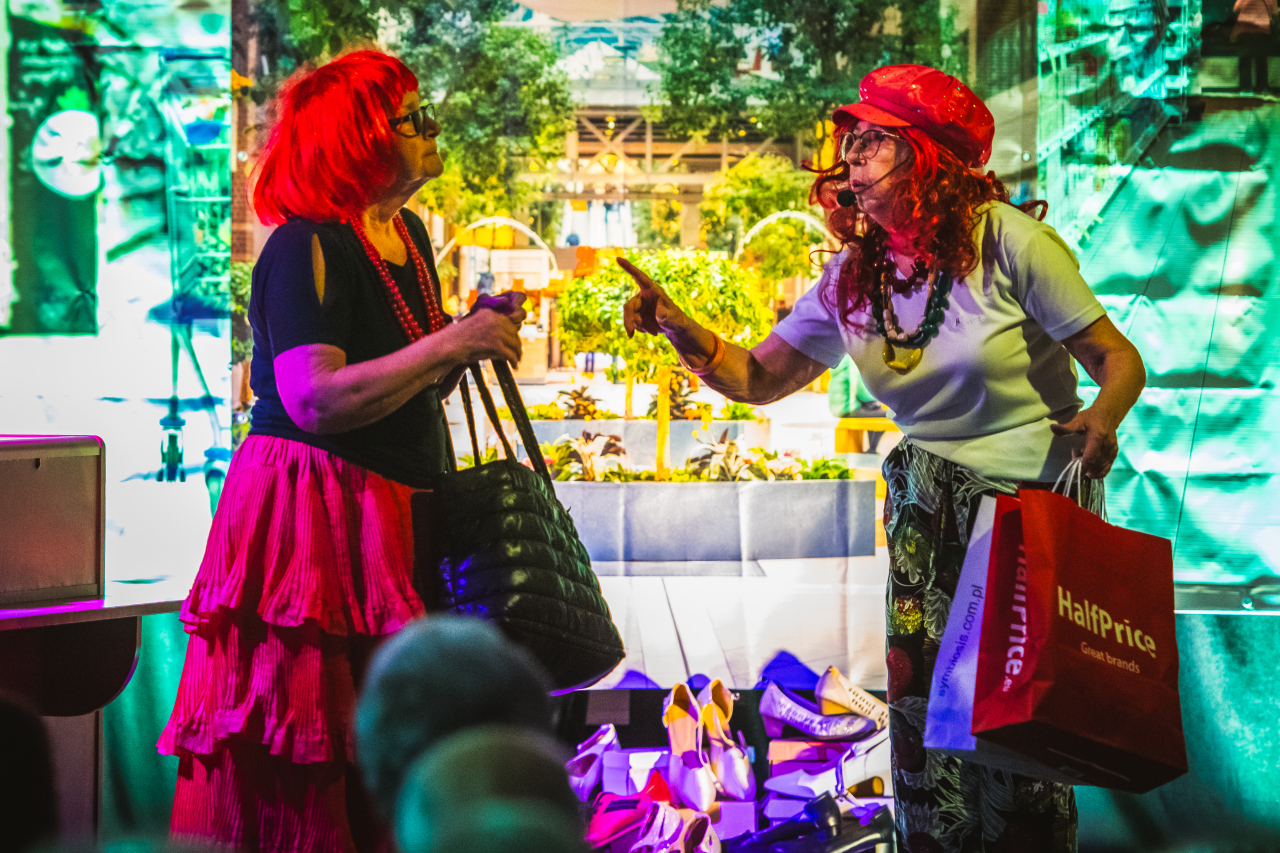 Aktorzy z kabaretu działającego przy bibliotece popisali się znakomitym wyczuciem komizmu, bawiąc publiczność dialogami pełnymi ciętych ripost i dowcipów sytuacyjnych. „Stoisko z pieczywem”, „Buty do dupy”, „Kolejka przed kasą” to tylko nieliczne, które zostały zaprezentowane. Sceny, w których kabaret pokazywał charakterystyczne typy klientów spotykanych w hipermarketach, idealnie trafiły w gust widzów, którzy odnajdywali w nich znane wszystkim sytuacje. Śmiechom towarzyszyły oklaski, a każdy kolejny skecz był przyjmowany z niegasnącym entuzjazmem.