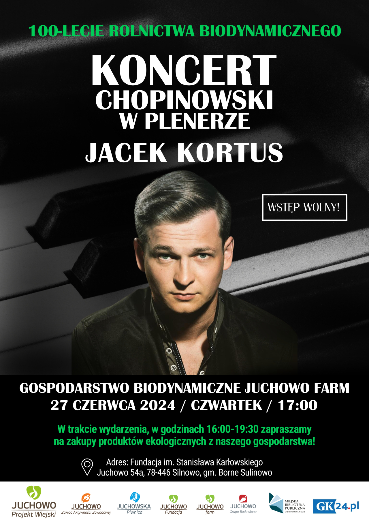 Miejska Biblioteka Publiczna w Bornem Sulinowie serdecznie zaprasza na Koncert Chopinowski w wykonaniu Jacka Kortusa, który odbędzie się w dniu 27 czerwca 2024 roku o godz. 17:00 na terenach gospodarstwa biodynamicznego „Juchowo Farm”. Spotkanie z klasyką w ramach 100-lecia rolnictwa biodynamicznego. Wstęp wolny!