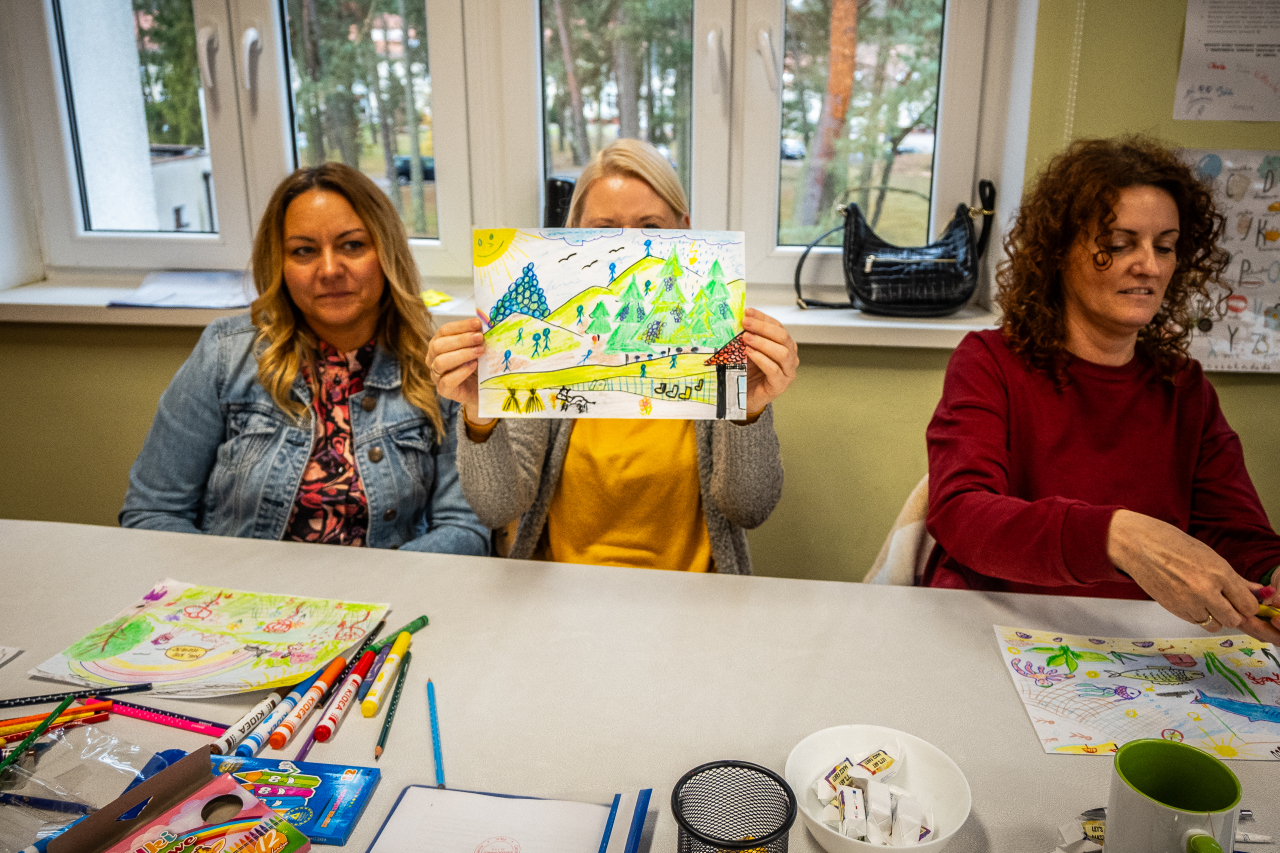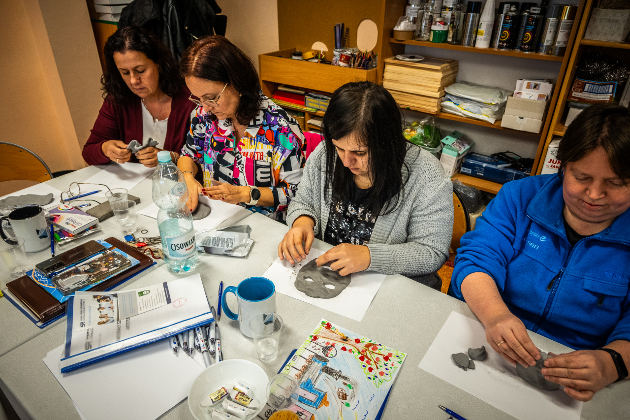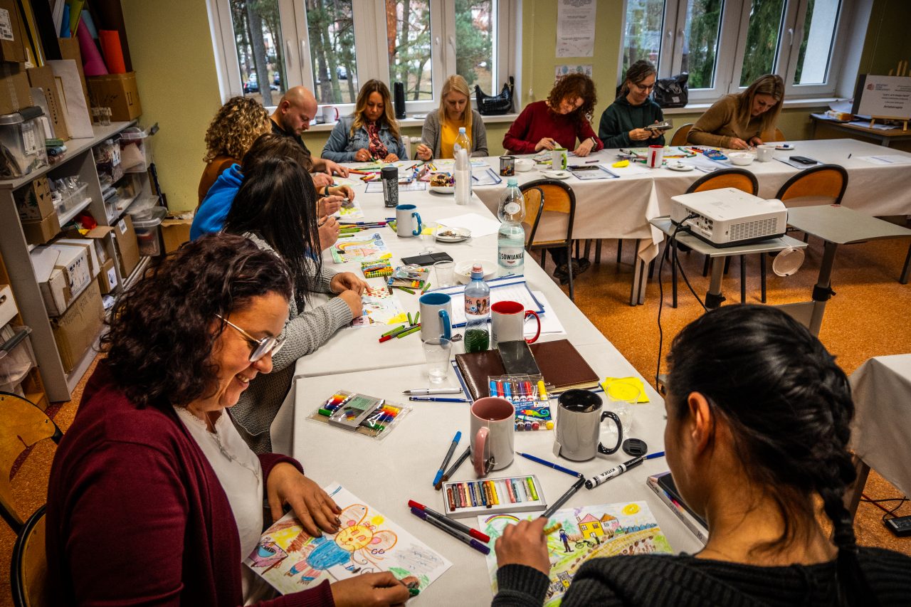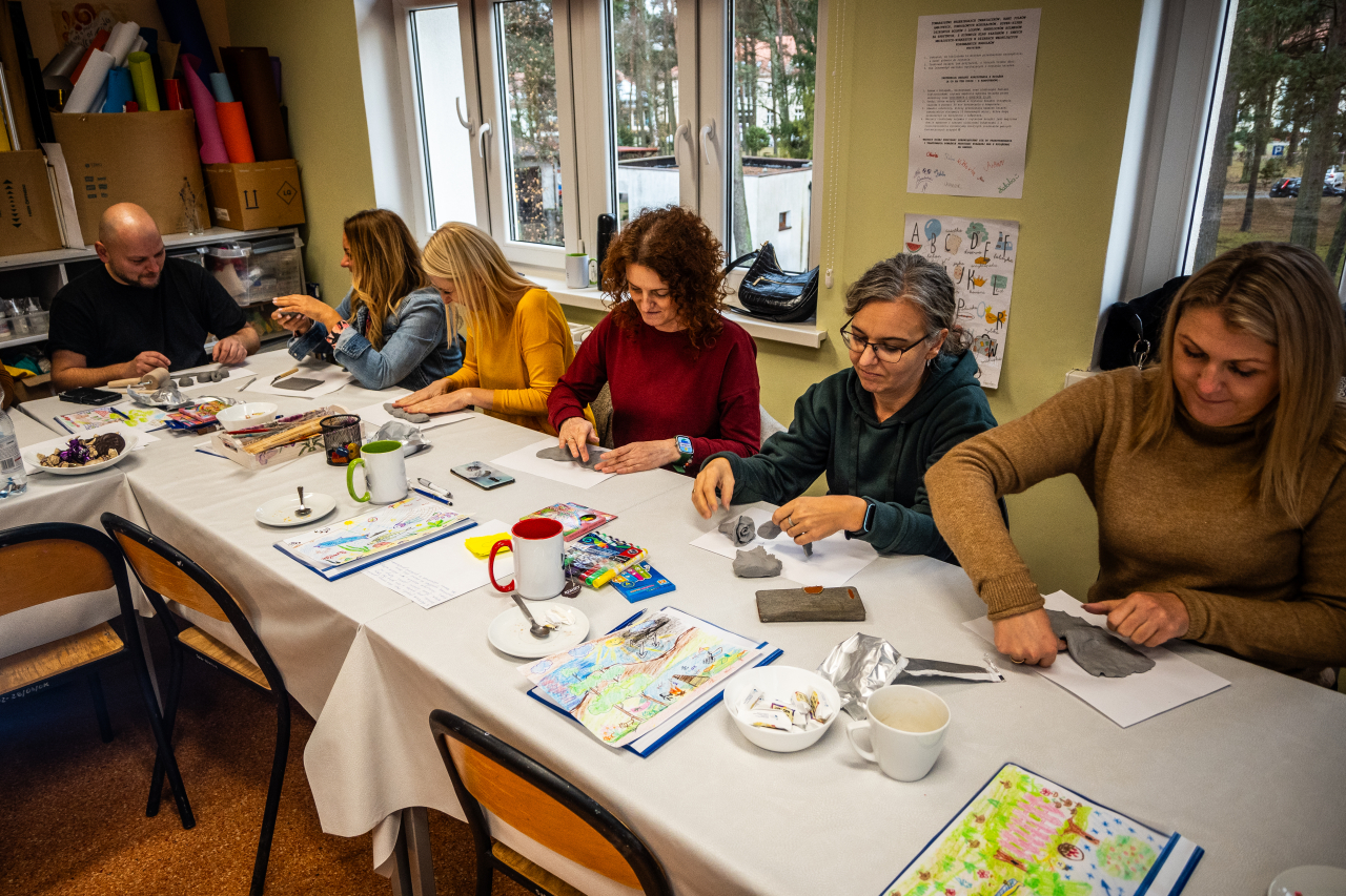 Na początek trochę teorii. Dowiedzieliśmy się, jak sztuka może pomagać w wyrażaniu emocji, radzeniu sobie ze stresem i odkrywaniu siebie. A potem… przeszliśmy do działania! Mieliśmy okazję spróbować różnych technik - malowanie, rysowanie, a nawet trochę rzeźby. Ogromnym atutem szkolenia było pokazanie, że arteterapia nie wymaga profesjonalnych umiejętności artystycznych - liczy się proces, a nie efekt. Ta perspektywa z pewnością ułatwi wdrażanie zdobytej wiedzy w praktyce - z dziećmi, młodzieżą, jak i dorosłymi.