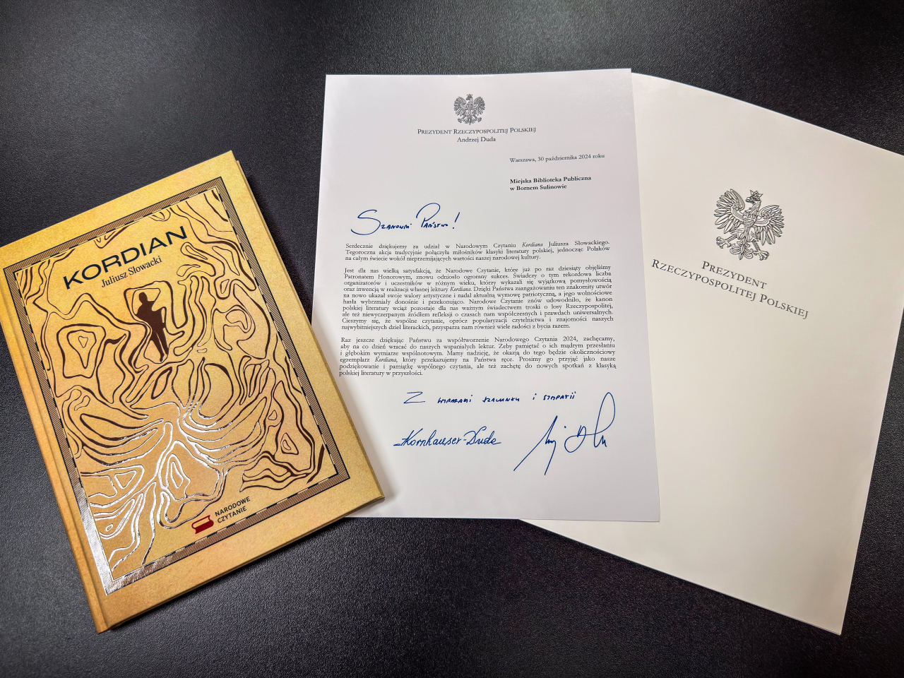 W związku z uczestnictwem w 13. edycji Narodowego Czytania, Prezydent RP skierował do wszystkich podmiotów biorących udział w akcji szerzenia uniwersalnych i patriotycznych wartości - w tym do Miejskiej Biblioteki Publicznej w Bornem Sulinowie - serdeczne podziękowania. Do listu został dołączony okolicznościowy egzemplarz „Kordiana” z autografem Prezydenta, który znajdziecie Państwo w naszej bibliotece!