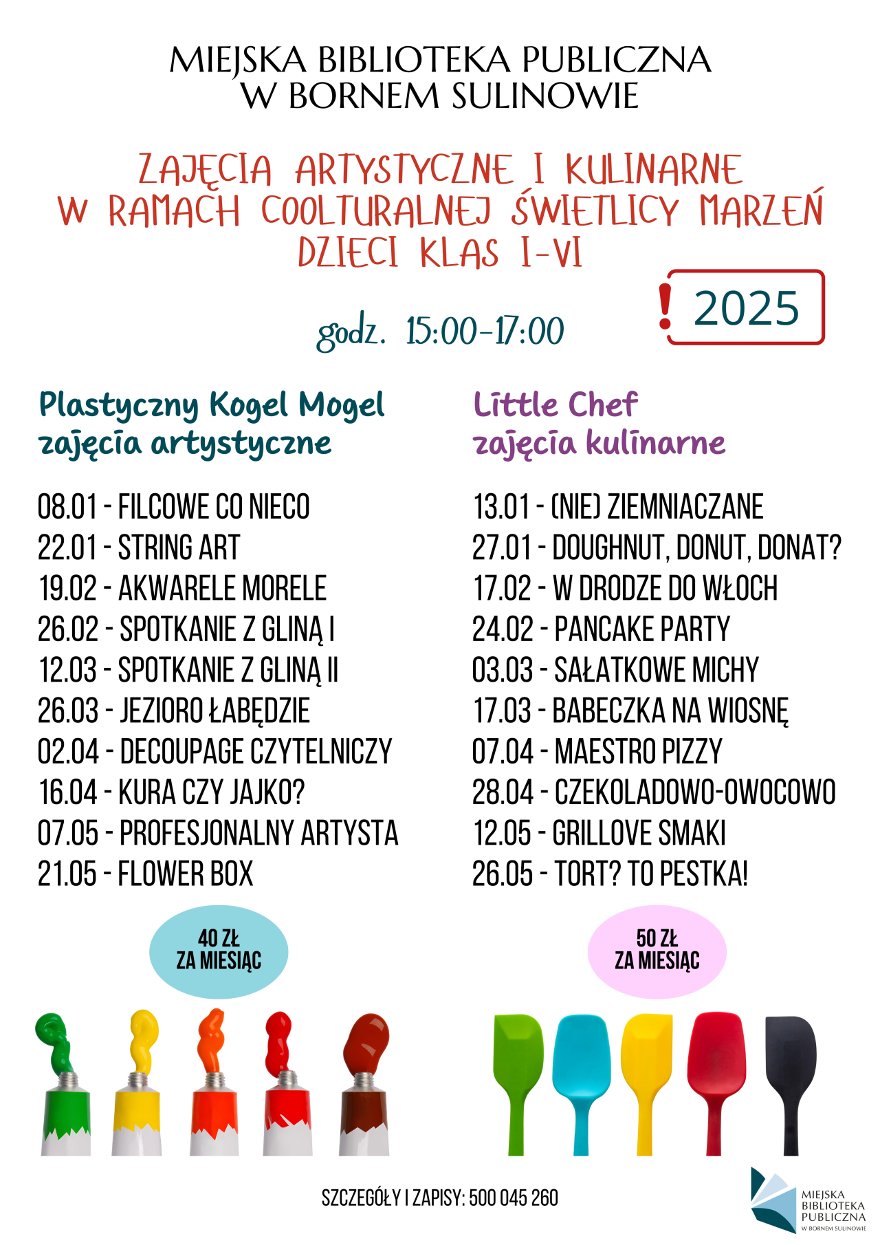 COOLturalna Świetlica Marzeń to unikalna propozycja zajęć pozalekcyjnych, która łączy rozwój pasji z kreatywną edukacją, stawiając na wszechstronny rozwój dzieci i młodzieży. Szczegółowe informacje na temat harmonogramu zajęć, zasad rekrutacji oraz opłat pod numerem tel. 500 045 260.